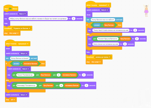 Самовилата поставува прашања и дава инструкции на ученикот за следен чекор. Таа ги потврдува точните одговори и ги поправа неточните одговори со давање на соодветен точен одговор. Подолу е прикажана сцената со Самовилата, како и нејзиниот код: