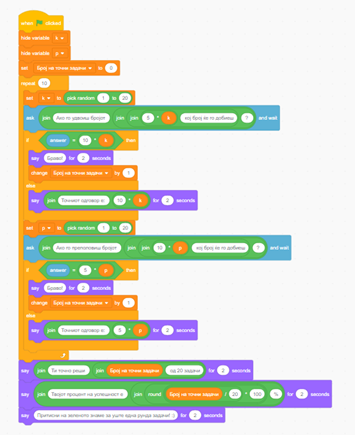Кодот е направен така што задачите се генерираат со случаен избор на одредени променливи од даден опсег на броеви и точно одредени операции со дадените променливи. Во овој пример поставено е да се генерираат вкупно 20 задачи, 10 со удвојување и 10 со преполовување. Овој број може да се менува со менување на бројот на повторувања во циклусот Repeat. Исто така во кодот е ставен бројач кој ги брои точно решените задачи. Кога ќе заврши со решавање на ученикот му се дава повратна информација за успешноста во решавањето. На овој начин е овозможено самооценување. Исто така се дава поттик за повторно решавање и остварување подобар резултат.