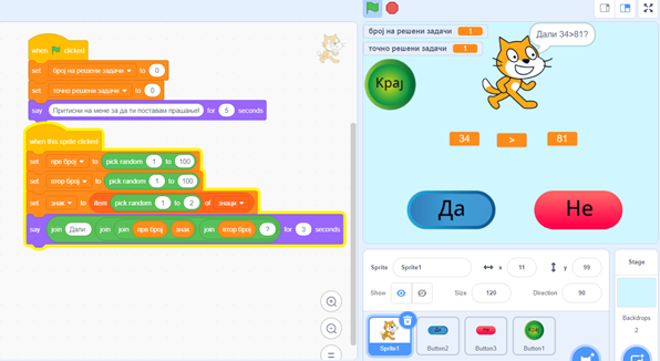- За кажување дијалог е искористен само еден блок “Say” зашто во текстот кај Мачето се користат знаците за помало и поголемо наместо зборови (имајќи во предвид дека учениците веќе ги усвоиле и препознаваат знаците)