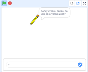 Ученикот треба да го внесе бројот на страни на многуаголникот чиешто цртање и цртеж сака да го види и потоа за кратко на екранот се исцртува соодветниот правилен многуаголник: