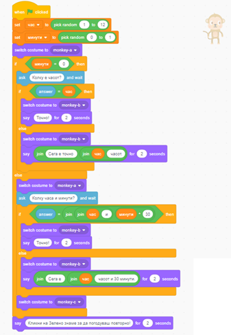 Оваа алатка се стартува со клик на Зелено знаме, пришто се генерираат произволни вредности на две променливи: час (во опсег од 1 до 12) и минути (0 или 1). Во зависност од вредноста на променливата „час“ часовната стрелка се поставува да покажува на бројот на часовникот соодветен на вредноста на променливата „час“. Ако вредноста на променливата „минути“ е 0 тогаш минутната стрелка ќе покажува на 12, односно ако вредноста на променливата „минути“ е 1 тогаш минутната стрелка ќе покажува на 6. Потоа Мајмунчето поставува прашање за тоа колку е часот и во зависност од одговорот дава повратна информација до ученикот. Ако вредноста на „минути“ = 0 се поставува прашање „Колку е часот?“ со очекување ученикот да внесе само број кој го означува точниот час. Ако вредноста на „минути“ = 1 се поставува прашање „Колку часа и минути?“ со очекување ученикот да внесе одговор од облик: „3 и 30“.