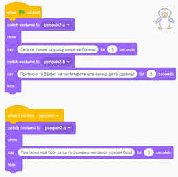 Оваа алатка се состои од повеќе карактери, односно секој број од 1 до 9 и секој нивен удвоен број е посебен карактер. Додека како водител низ презентацијата се јавува карактерот „Пингвин“. Пингвинот дава инструкции на ученикот да притисне број на тастатурата за кој сака да научи кој е негов удвоен број. Подолу е прикажана сцената со Пингвинот, како и неговиот код: