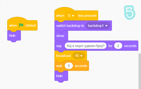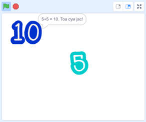 Секој број карактер е скриен и се појавува кога ученикот ќе го притисне соодветниот број на тастатурата. На пример со притискање на бројот 5 ја имаме сцената на која се појавува бројот 5 со облаче за говор, а по 2 секунди се појавува и неговиот удвоен број 10.